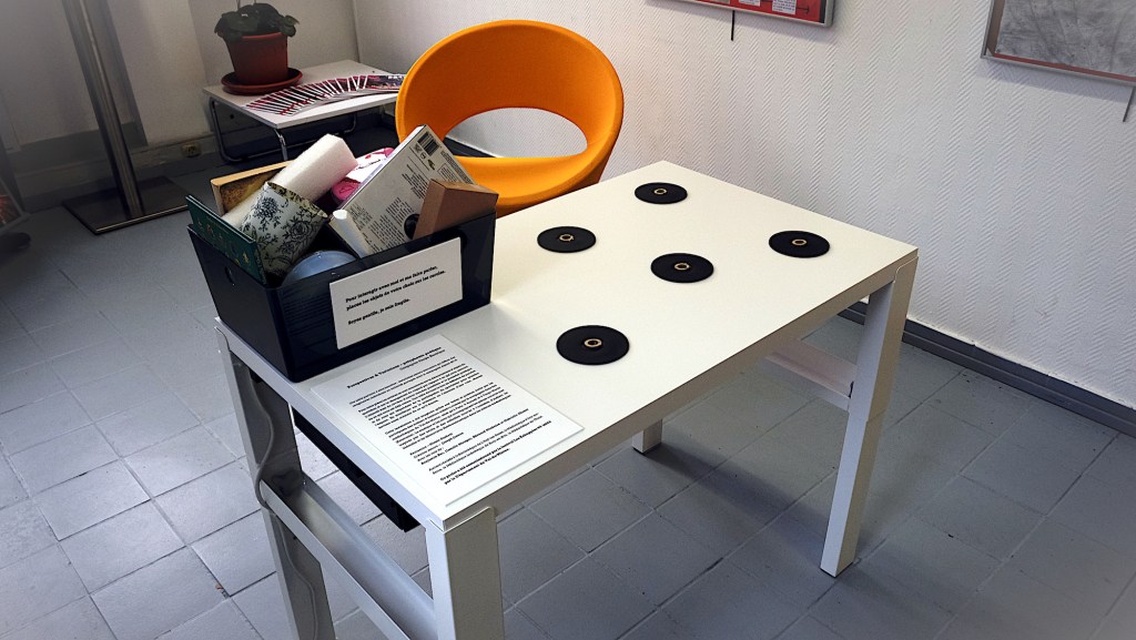 Pour cette pièce les artistes se sont concentrés sur le détournement d’objets du quotidien et sur le changement de regard par rapport à ce qui nous entoure. L’objectif était de révéler d’autres mondes possibles et le potentiel poétique de ce qui nous est déjà connu. Une table devient le lieu de diffusion de paroles et de sons qui dépendent de la participation du spectateur pour prendre l’espace. En interférant sur la présence ou l’absence d’une voix, chacun devient aussi créateur de ce qu’il écoute.